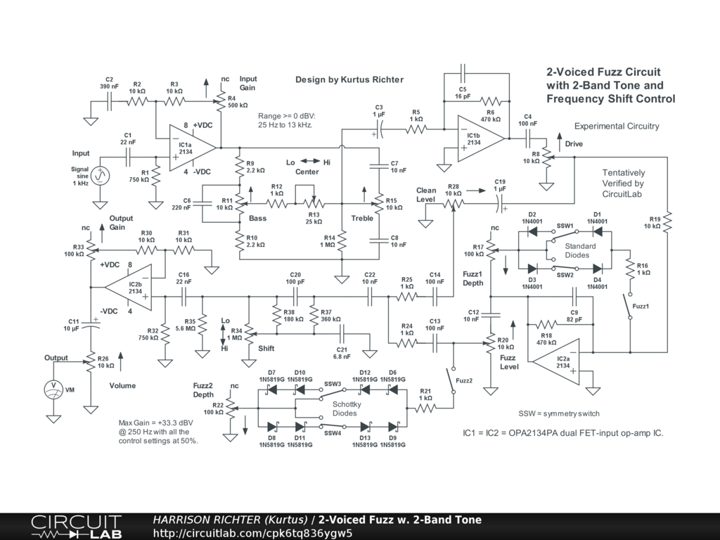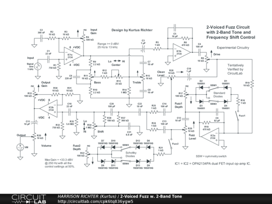 2-voiced diode-fuzz circuit for electric guitar, with 2-band tone and a frequency shift controls. Uses two dual FET-input op-amp ICs and ten diodes of different kinds. Controls Include: Input Gain, Bass, Treble, Tone Center, Drive, Clean Level, Fuzz 1 enable switch, Fuzz 1 symmetry switches (two, with 2 settings each), Fuzz 1 Depth, Fuzz 1 Level, Fuzz 2 enable switch, Fuzz 2 symmetry switches (two, with 2 settings each), Fuzz 2 Depth, Frequency Shift, Output Gain, and Volume. Range at or above 0 dBV is from 25 Hz to 13.3 kHz. Suitable for 6/7/8-string guitar or 4/5/6-string bass. Maximum gain = +33.3 dBV @ 250 Hz with all controls at 50%, or +59 dBV @ 160 Hz with all controls at 100%. Note: The Shift control greatly affect gains at different frequencies, shifting between emphasizing lows and highs. Diode arrays have little / no effect on gains or frequencies, but offer only fuzz sound from clipping, with standard silicon diodes in a soft-clipping (feedback type) array, and Schottky diodes in a hard-clipping (shunt type) array. Power-supply not shown. Requires a regulated dual-polarity DC supply providing +-9VDC or +-12VDC or +-15VDC at >= 50 mA of current. And while simulator verified, treat the circuit as experimental in nature. Thoroughly breadboard test before committing to a soldered build. And house in a grounded metal enclosure.