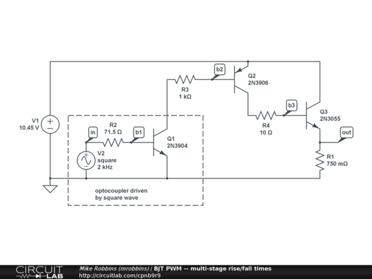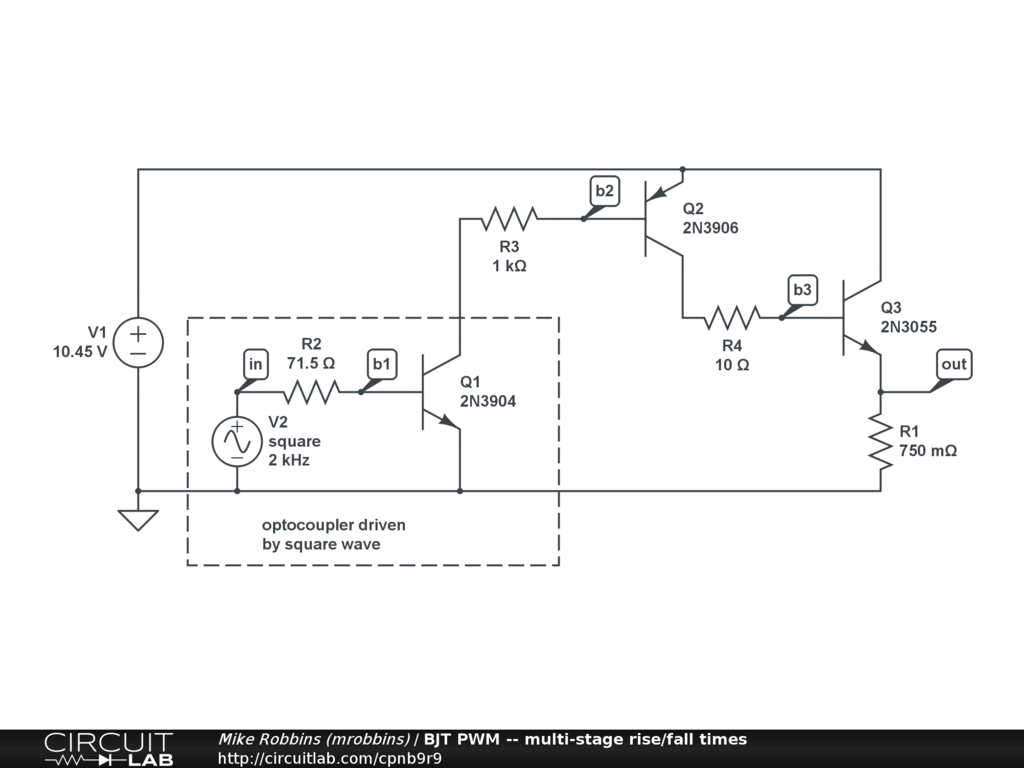 V2, R2, Q1 model the square-wave-switched optocoupler.