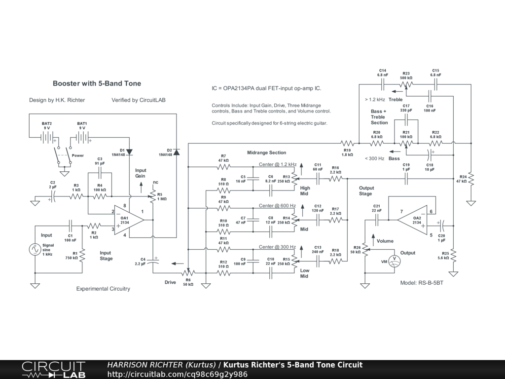 Special 5-band tone-control circuit using dual op-amp IC. Controls Include: Input Gain, Drive, three Mid controls, Bass and Treble controls, and output Volume control. "Special" means the circuit in especially designed for electric guitars where the Mid controls do not affect signal levels, like Bass and Treble, but shift the centers of specified frequency bands. Input stage is built around a TL082CP dual JFET-input op-amp IC with two low-end cutoffs (80 Hz and 40 Hz) and one high-end cutoff (18 kHz), which reflect frequencies optimized for 6-string guitar in standard tuning. Suitable for stomp-box or rack-mount applications. For overdriving to get distortion with large input signal, replace the specified IC with an NJM5532M, but which will drain the batteries more quickly. In that case, the batteries should be replaced by a regulated dual-polarity +-9V DC power-supply providing at least 40 mA of available current. Total gains per frequency with all pots at middle positions, and using a 1 V p-p 1 kHz input signal, are; -4.6dBV @ 16Hz, 0dBV @ 20Hz, +3dBV @ 25Hz, +10dBV @ 40Hz, +20dBV @ 100Hz, +23dBV @ 250Hz, +22dBV from 630Hz to 1.5kHz, +21dBV @ 4kHz, +17dBV @ 10kHz, +15dBV @ 15kHz, and +13dBV @ 20kHz. Absolute maximum total preamp gain = +46dBV @ 250Hz.