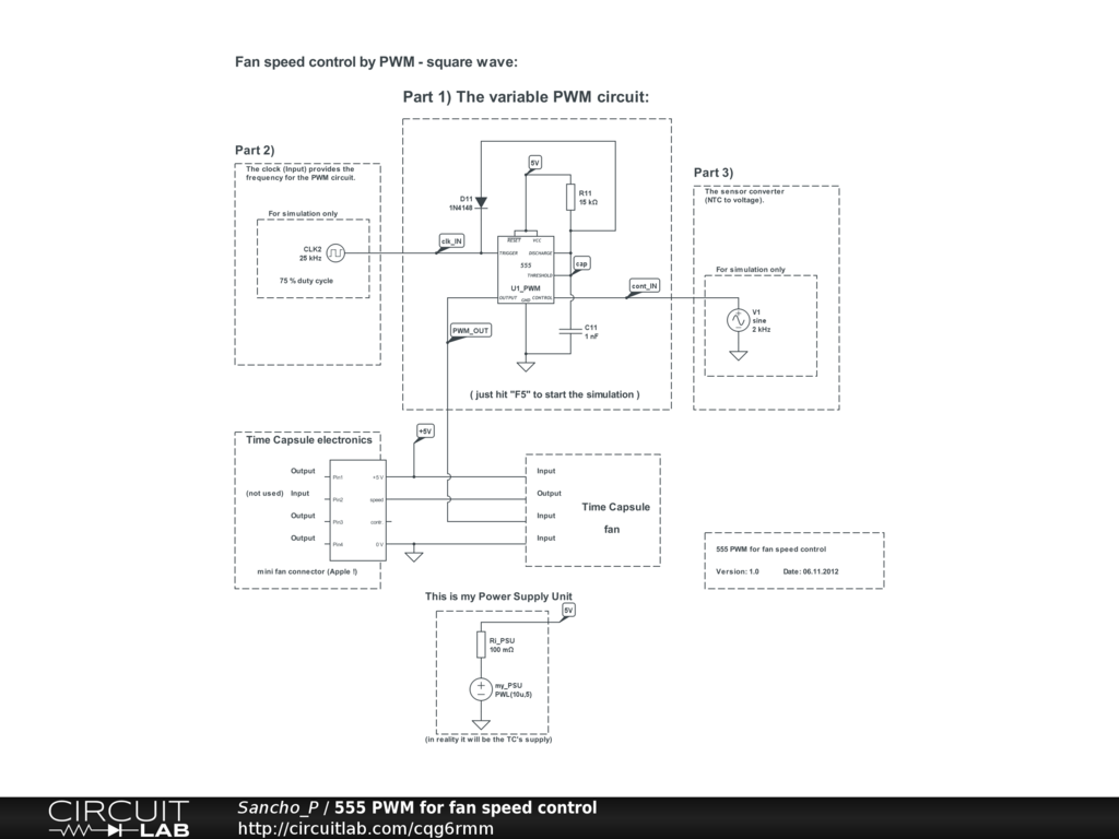 Part 2) 555 clock for fan speed control A simple 555 timer circuit. It could be used to directly set the fan speed to a fixed value, but I want to “hear” the temperature of my Time Capsule. The timer output is used to trigger the main PWM timer.