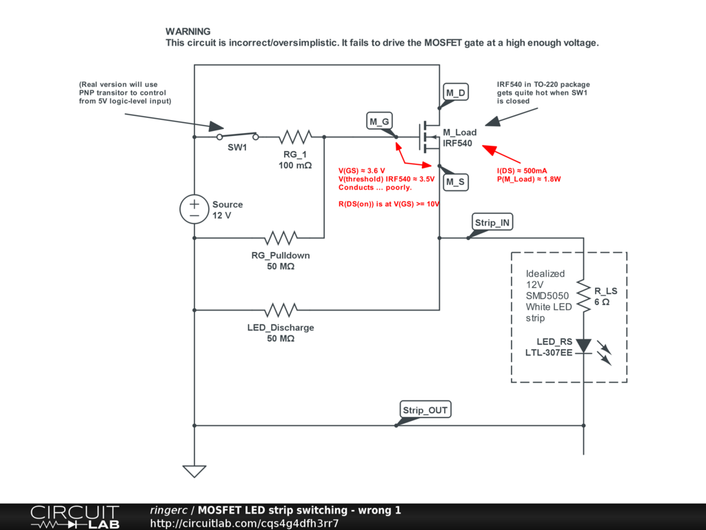 Example written for this stackexchange question, showing an incorrect application of a IRF540 MOSFET to switch a 12V load.