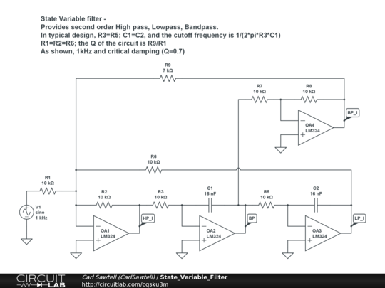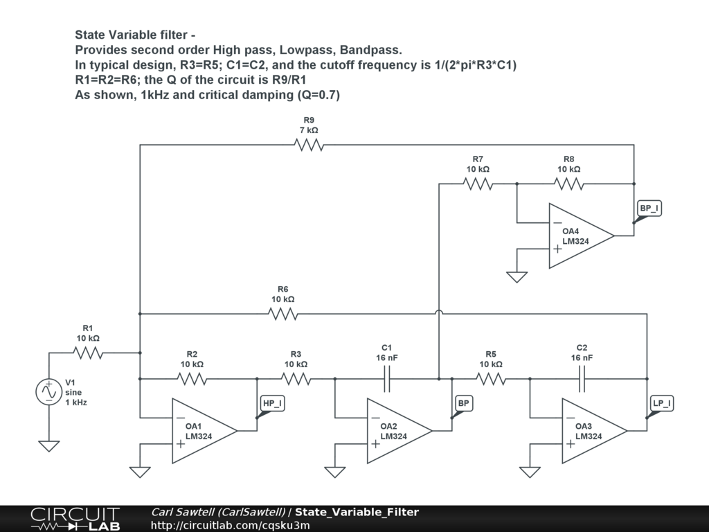 This 4 amplifier variant on SV filter allows all amps to be inverting. Provides Lowpass, Highpass and both inverted and non-inverted Bandpass outputs.