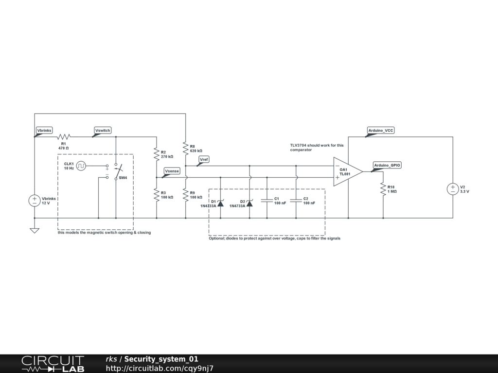 Circuit to step down the 0V to 14V signals from a home security system down to the 3.3V or 5V level of the Auduion GPIOs.