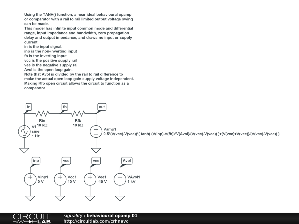 Using the TANH() function, a near ideal behavioural opamp or comparator with a rail to rail limited output voltage swing can be made.