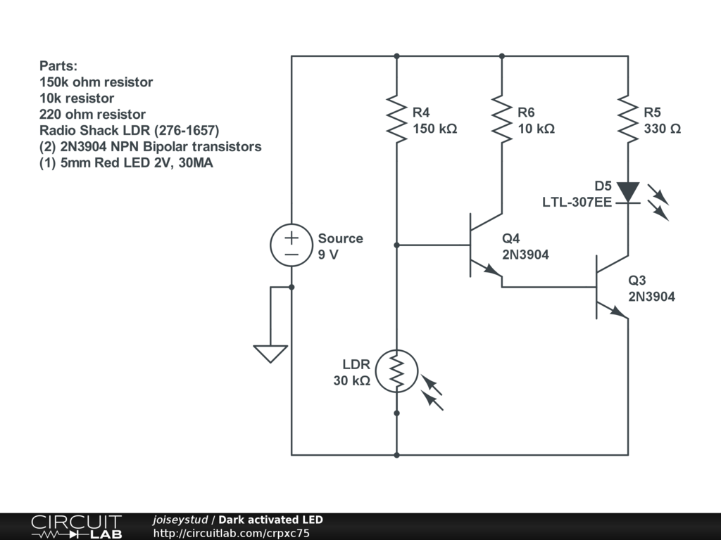 This circuit uses 2 NPN Transistors and an LDR to create a automatic on for an LED in this case. It has very good response, and low power consumption in light.