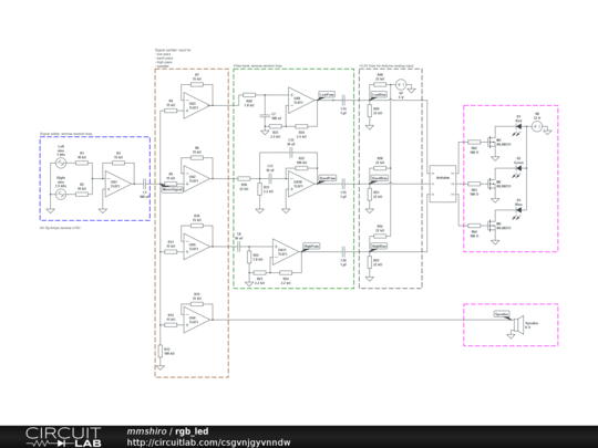 Not shown, and already implemented, are the following: - Arduino samples the three signals and calculates signal strength - Arduino controls RGB channels of a LED strip with brightness in each color proportional to signal strength in low/mid/treble. LED strip is controlled indirectly via logic-level MOSFETs.
