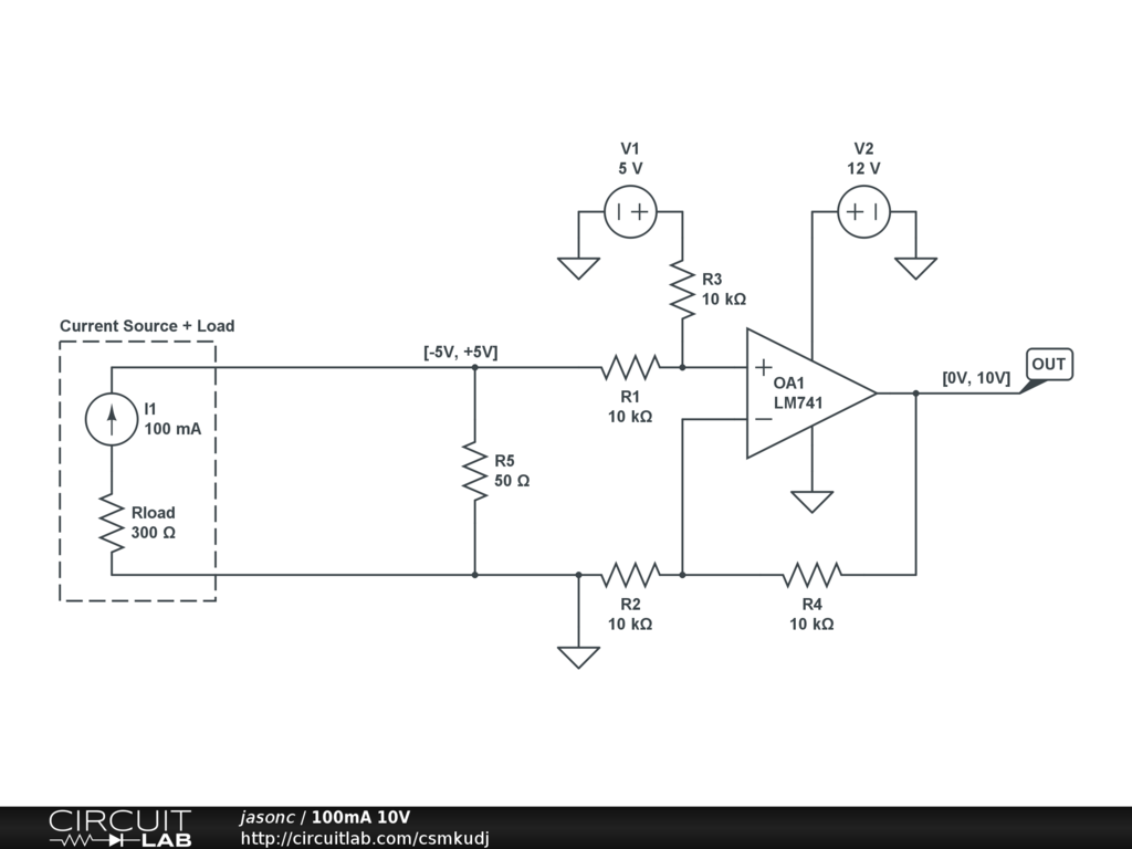 Maps [-100mA, +100mA] input to [0V, 10V] output. 50 ohm resistor creates [-5V, +5V], op-amp circuit offsets by +5V. http://www.edaboard.com/thread256277.html
