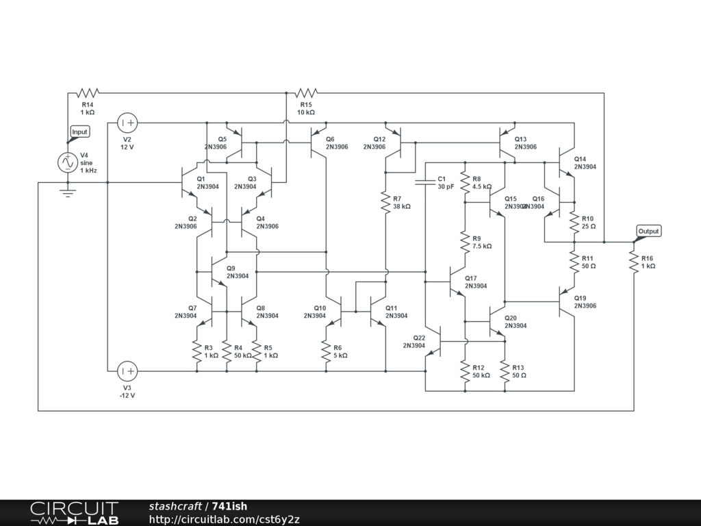 A sort of 741 recreation. Seems to tax Circuit Lab's simulator...probably just too complicated. Also the transistors aren't exactly IC spec...