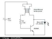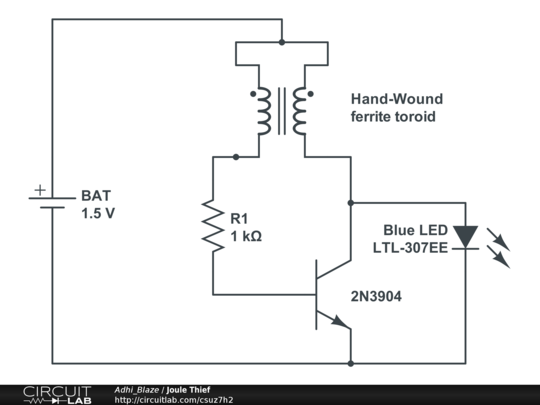 Step-by-step run through of how a Joule Thief circuit works. Includes how all the parts, the 1.5 volt AA battery, the resistor, the transistor and the ferrite core with its two coils of wire work together to build up energy in a magnetic field which then collapses to produce enough voltage and current to light an LED (Light Emitting Diode.) This includes explanations of the feedback that rapidly opens the transistor between base and emitter to open up the emitter to collector too. And also the feedback that slams the transistor shut again.