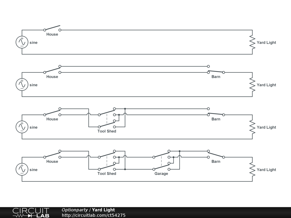 2 wires - Power, 2 wires - Yard Light, 3 wires - between buildings. . . Add as many DPDT switches as needed.