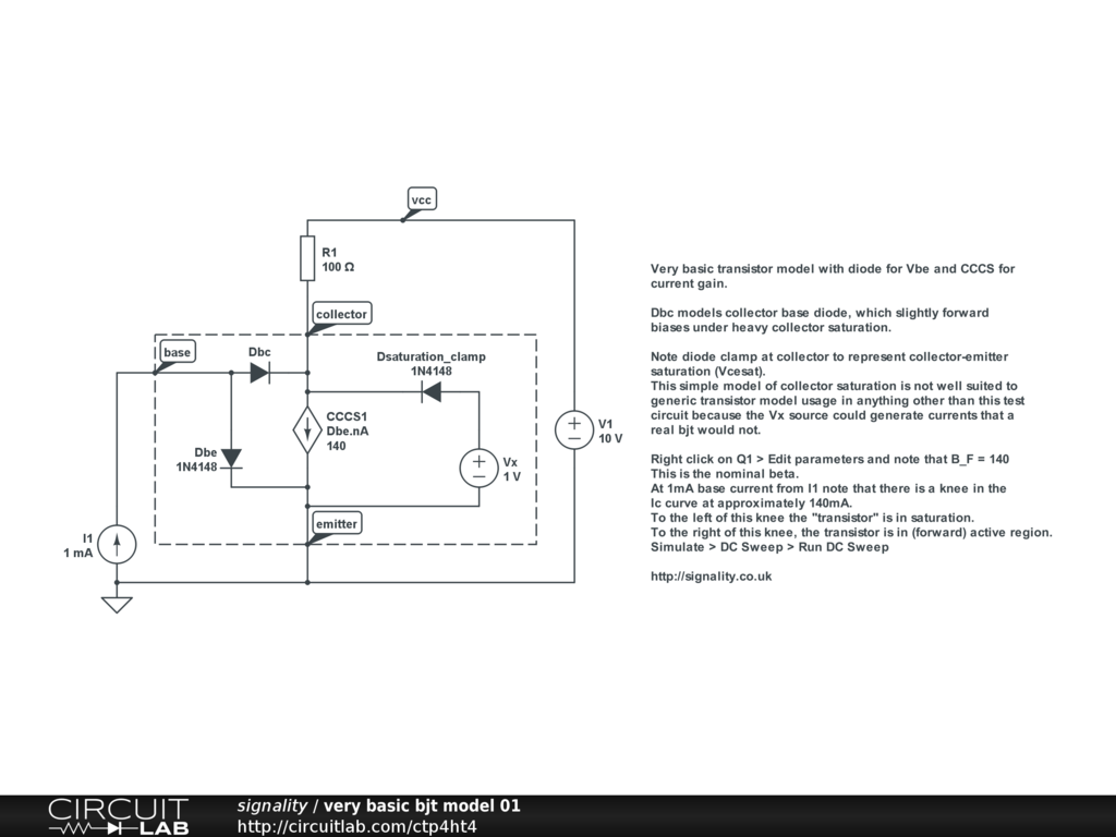 Note diode clamp at collector to represent collector-emitter saturation (Vcesat). This simple model of collector saturation is not well suited to generic transistor model usage in anything other than this test circuit because the Vx source could generate currents that a real bjt would not.