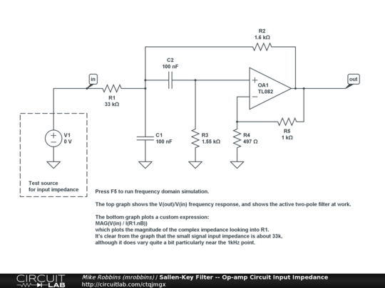 Shows how to calculate the input impedance of an op-amp circuit, in this case a Sallen-Key filter.