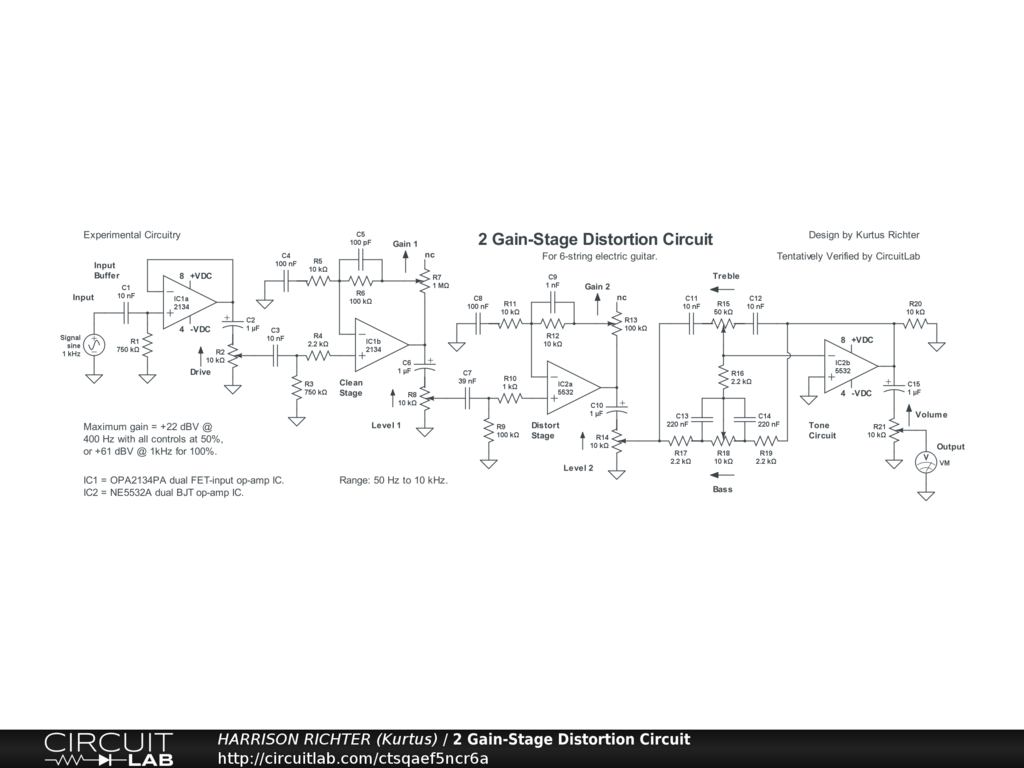 Distortion circuit for 6-string electric guitar. Includes two stages of gain, one clean and one for distortion, and a 2-band active James-style tone-control. Uses one dual FET-input op-amp IC for clean boost and one dual BJT op-amp for distortion and active tone. Controls Include: Drive, Gain 1, Level 1, Gain 2, Level 2, Bass, Treble, and Volume. The 0 dBV low corner is 51 Hz. Range between low and high 0 dBV corners is from there to 10 kHz, with 20 kHz down by -12 dBV. Ideal for 6-string electric guitar in standard tuning. Maximum gain = +22 dBV (Vo/Vi = 12.6) @ 400 Hz with all controls at 50%, or +61 dBV (Vo/Vi = 1122) @ 1 kHz with all controls at 100%. The Treble control cuts 10 kHz down to -6.4 dBV or boosts it to +5 dBV, while the Bass control cuts 100 Hz down to +3.7 dBV or boosts it to +20 dBV. The Mids are fixed. Power-supply not shown. Requires a regulated dual-polarity DC supply providing +-9VDC or +-12VDC or +-15VDC at >= 30 mA of current. And while simulator verified, treat the circuit as experimental. That is, breadboard test before committing to a soldered build.
