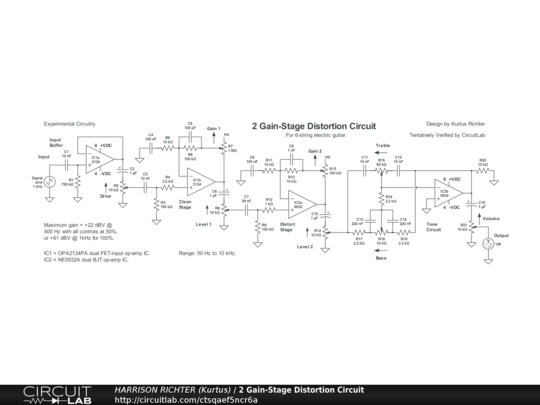 Distortion Circuit for Guitar with 2 Gain Stages and 2-Band Tone