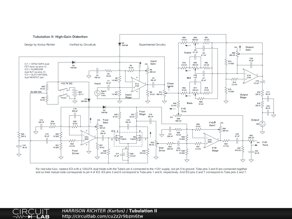 Largely the same as the original Tubulation: High-Gain Distortion circuit, but with a different 3-band tone-control circuit, re-adjusted part-values, and different control labels. Controls Include: Input Gain, Clean Level, Fuzz Gain, Distortion Drive, Fuzz + Distortion Gain, Fuzz + Distortion Tone, Fuzz + Distortion Trim, Bass, Mid, Treble, and Output Gain. The original Fenter-style tone-stack has been replaced by a Baxandall tone-control with mid control added. As with the first Tubulation circuit, the Fuzz is obtained from overdriven depletion-mode MOSFETs while Distortion is from overdriving two CMOS op-amps, though the MOSFET IC can be replaced by a 12AX7A preamp tube; with directions given at the bottom of the diagram. Frequency range between the -3 dBV corners and with all controls at 50% is from 10 Hz to 33 kHz. The most usable range is from 40 Hz to 6.3 kHz, while mids between 100 Hz and 1 kHz is flat at +24 dBV, with all controls at 50%. Circuit is therefore suitable for 6/7/8-string guitar and 4/5/6-string bass. Maximum gain = +24 dBV with all controls at 50%, or +44 dBV @ 1.6 kHz with all controls at 100%, and at which the range extends from 10 Hz to 100 kHz. The battery should be replaced by a regulated +12V DC power-supply. Also, treat the circuit as experimental in nature. Breadboard test before committing to a soldered build.