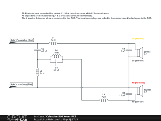 A friend was having some sound issues with a 2nd hand set of Celestion SL6 speakers. A passive Xover PCB is inside the cabinet & I accessed it by removing the aluminum plate around the speaker & then popped out the speaker (it's not glued in). I then removed 2 swathes of acrylic matting (looks like the filling from a comforter). Then I un-bolted the 2 nuts from the input jacks as these are what holds the PCB in place & also makes the electrical connections to it. The PCB has 4 inductors & 4 non-polarized capacitors & no resistors. Unfortunately the inductor values are not marked & I don't own a 'Z' meter, so I cn only assume that they are in micro henries. Of these, L2 has an air core while the other 3 have iron cores. C1 & 2 are axial non polarized aluminum electrolytics & the other 2 (smaller values) look like metal film types.
