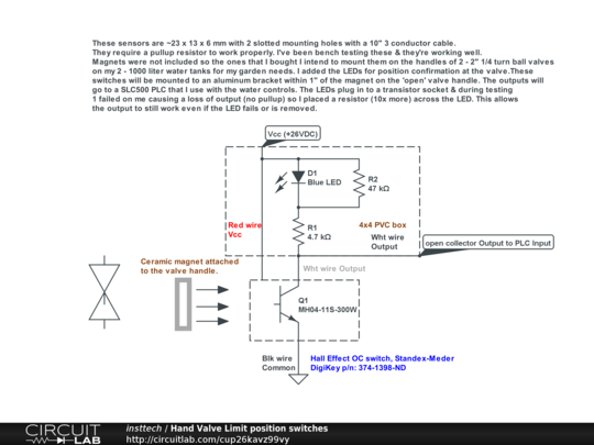 I have a 1000 liter tote tank that I use for my gardening needs. Last year's rainfall was so much that I had to dump the tank 3 times but this year (2024) it was down to 40% level before we got some decent rain. So I decided to get a second tote tank & piped in parallel with the 1st tank. This will allow me to store some reserve when we get a lot of rain & at this time of the year (Sept) the grow season is starting to wind down, meaning that I won't need 2000 liters of water. So I can leave the auxiliary tank out of service (outlet valve closed). My water system & greenhouse are all PLC controlled so with the new tank I want to have position data sent to the PLC. If I have 1 or both tanks out of service the logic will take the appropriate action to operate & protect the equipment. These tiny plastic 'modules' have a short 3 conductor cable needing Vcc, common & the output. They're water proof & will go to a small water tight JB with a few terminal blocks & a window for the LED. The circuit shown will be duplicated for the other tank & although I have a bit more instrumentation to go for the new tank, these items are tricky as I need to fab non-ferrous (aluminum) customized brackets to mount the sensors near to where the valve handles will be when they're open (they're 1/4 turn ball valves). This is still a work in progress & I'll update these details later. Apr 2025: I've installed these valve position transducer modules back on both tanks & are working well as inputs to the PLC controlling my water system.