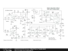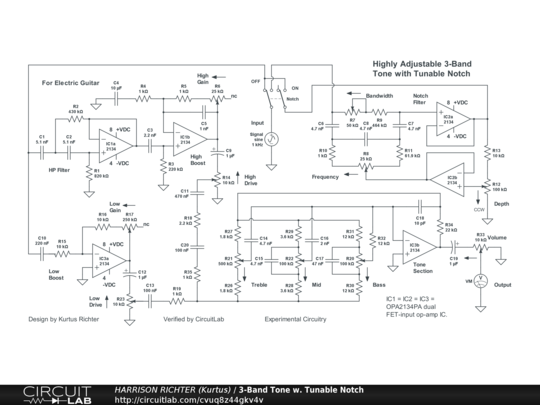Highly adjustable 3-band tone-control circuit with tunable notch filter. Controls Include: Notch enable switch, Notch Bandwidth, Notch Frequency, High Gain, High Drive, Low Gain, Low Drive, Bass, Mid, Treble, and Volume. With Notch OFF, range between high and low -3 dBV corners is from 32 Hz to 18 kHz, and between the 0 dBV points is from 40 Hz to 14 kHz. Thus, the circuit is suitable for 6/7-string guitar (but not 8-string guitar or bass-guitar). Also with Notch OFF, maximum gain is +12 dBV @ 250 Hz with all control settings at 50%, or +33.2 dBV @ 100 Hz with all controls at 100%. This means the circuit provides moderately high gain with control settings > 50%. However, do not use with all controls at 100% except as a brief worst-case test while breadboarding. Again with Notch OFF, Treble can adjust between 0 dBV and +11 dBV @ 10 kHz, Mid can adjust between +9 and + 13 dBV @ 1 kHz, while Bass can adjust between +4.3 dBV and +15.1 dBV @ 100 Hz. With Notch ON, Notch Frequency adjusts from 400 Hz to 4kHz, Notch Bandwidth adjust from 980 Hz to 26 kHz, and Notch Depth adjusts from -5 dBV to -50 dBV. Yet, Notch controls are interactive with each other, and also affect response at higher frequencies. Examples Gains per Frequency with Bandwidth and Depth at 50%: -4.3 dBV @ 400 Hz, -29 dBV @ 630 Hz, -22.4 dBV @ 2.5 kHz. The power-supply is not shown in the diagram. The circuit requires a regulated dual-polarity DC supply providing +-9VDC or +-12VDC or +-15VDC at >= 40 mA of current. Project can be stomp-box or rack-mounted. And while the circuit is simulator verified, consider it experimental in nature. Thoroughly breadboard test before committing to a soldered build. House in a grounded metal enclosure.