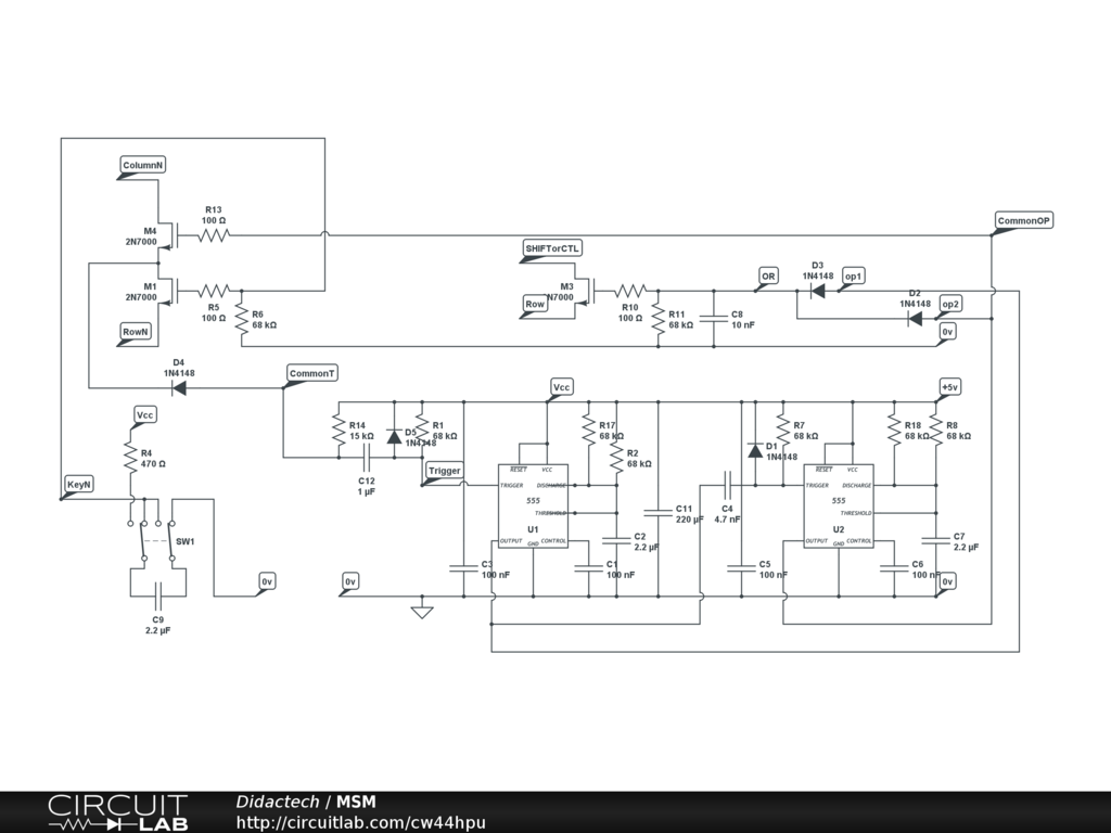 To simulate multiple key hold on a PC Keyboard encoder like 'Shifted' characters or 'Control' characters the SHIFT and/or CTL key must be selected before the required key. This circuit uses a 555 Timer to activate a MOSFET switch when triggered by a physical switch and the falling edge triggers the next 555 Timer to activate the required key press via the upper MOSFET: The two outputs are diode 'ORed' to maintain the SHIFT/CTL key press for the total period.