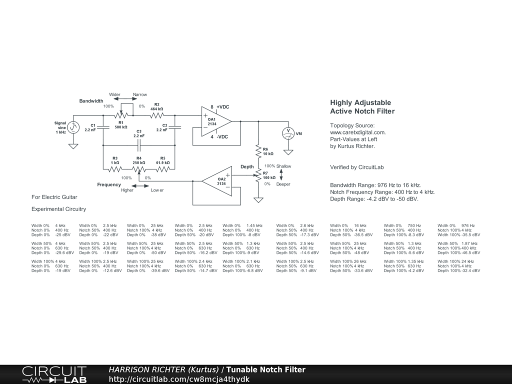 Active notch filter using op-amps. Features tunable notch frequency, adjustable notch bandwidth, and adjustable notch depth. Part-values fixed. Results of different control settings given with the diagram. Useful for providing control of a hump or peak in an op-amp circuit's frequency response curve. Power-supply not shown. Requires a regulated dual-polarity DC supply providing +-9VDC or +-12VDC or +-15VDC at >= 20 mA of current. Breadboard test before committing to a soldered build.