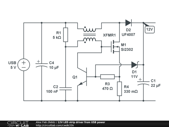 12V LED strip driver from USB power using small MOSFET.
