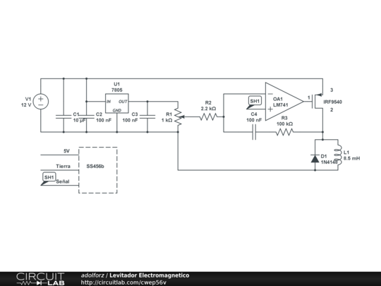 Para determinar la posición del objeto levitante (imán de neodimio) se hace uso de un sensor de efecto hall. Este sensor detecta la intensidad del campo magnético y con esto la posición del objeto levitante y proporcionan un voltaje de salida que es proporcional a la misma. La salida del sensor se compara con una referencia, que se establece en algún nivel de error definido. El lm741 ajustará el ciclo de trabajo del actuador con el fin de mantener la salida del sensor en el nivel correcto mediante la corriente proporcionada al actuador