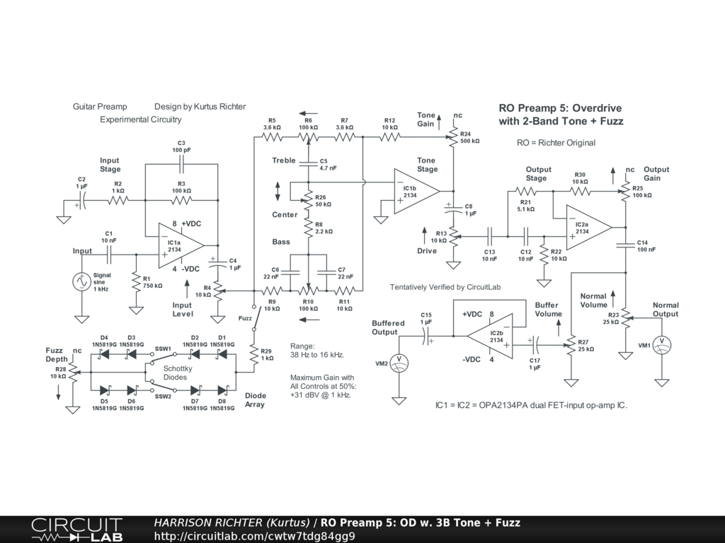RO-Series Preamp 5: Overdrive with 2-Band Tone and Fuzz. Controls Include: Input Level, Fuzz enable switch, Fuzz symmetry switches, Fuzz Depth, Bass, Mid Center, Treble, Tone Gain, Drive, Output Gain, Normal Volume, and Buffer Volume. Two dual op-amp ICs are used to get three gain stages for a normal output, plus a unity-gain buffer for providing a buffered output extra. Range at or above 0 dBV is from 38 Hz to 16 kHz with all controls at 50%. Suitable for 6/7/8-string guitar or 4/5/6-string bass. Maximum gain = +31 dBV (Vo/Vi = 35.5) @ 1 kHz with all controls at 50%, or +69.8 dBV (Vo/Vi = 3090) @ 2.5 kHz with all controls at 100%. This places the circuit in the high-gain overdrive category. [Do not use the circuit with all controls at 100% except briefly as a worst-case test during breadboarding.] Power-supply not shown. Requires a regulated dual-polarity DC supply providing +-9VDC or +-12VDC or +-15VDC at >= 50 mA of current. And while simulator verified, treat the circuit as experimental. Thoroughly breadboard test it before committing to a soldered build. House in a grounded metal enclosure.