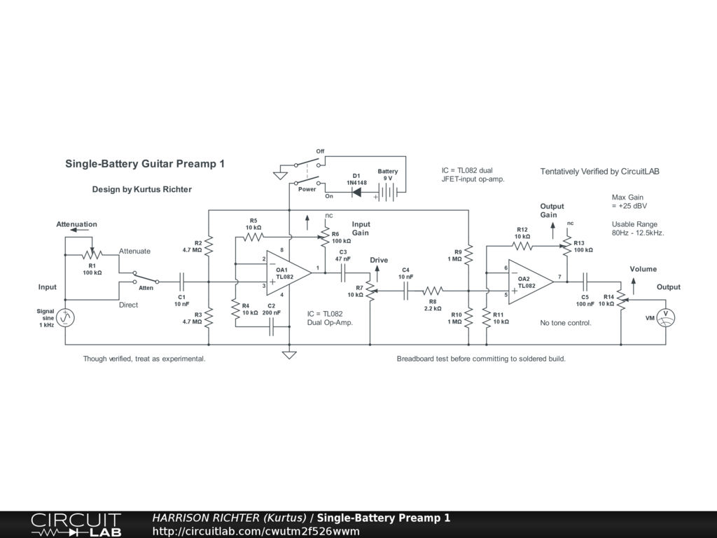 2-stage guitar preamp powered by a single 9V battery. Controls Include: Input Attenuation enable switch (Attenuate or Direct), Attenuation control, Input Gain, Drive, Output Gain, Volume. No tone controls. Frequency Range 80 Hz to 12.5 kHz. Maximum Gain +25 dBV @ 500 Hz. For 6-string guitar in standard tuning. As is, this is a medium-gain circuit for signal boosting. For increasing Gain sufficient to use as an overdrive, raise values of both Gain pots to 250k each, resulting in possible Maximum Gain of +39 dBV.