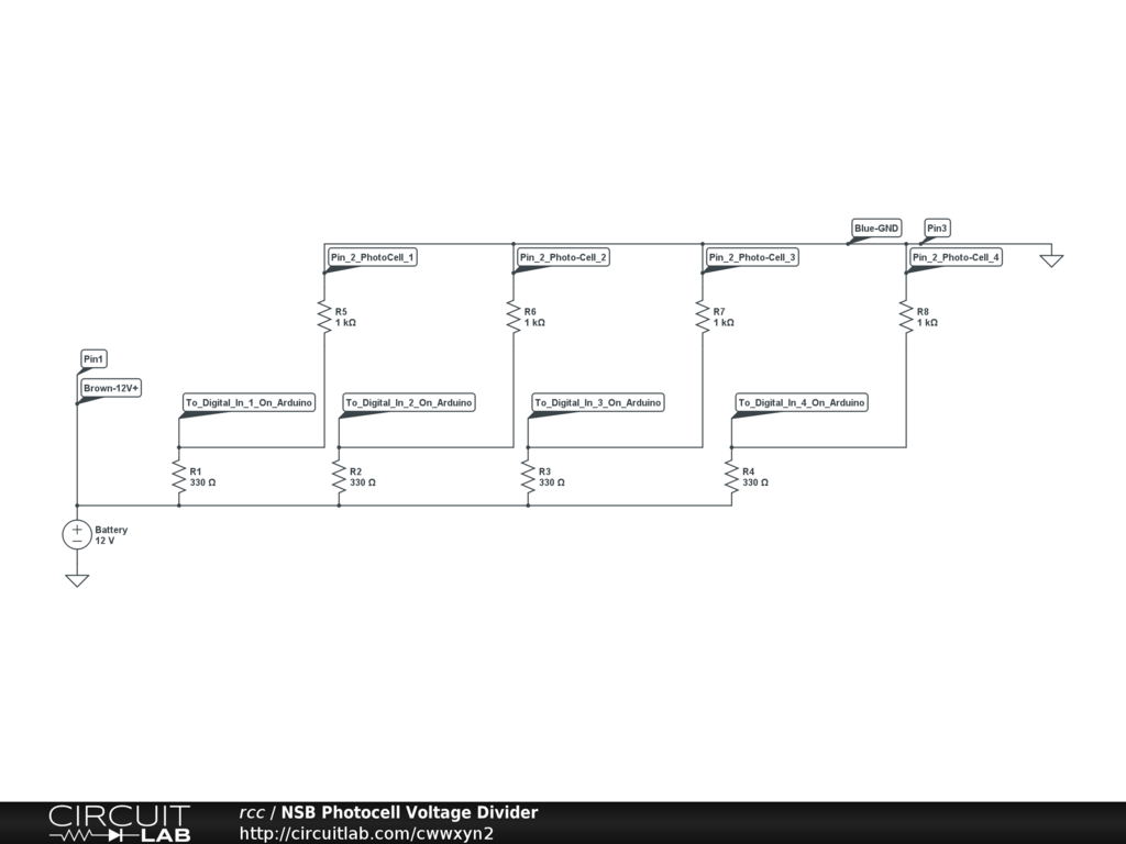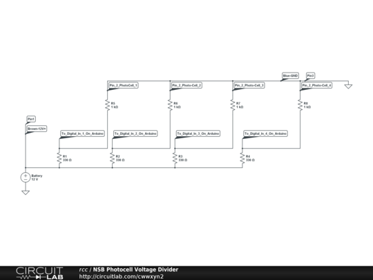 A circuit to interface the Banner Photocells, which operate at 12V, to the Arduino inputs, which have a suggested digital input of 9V.