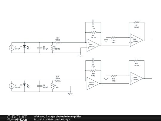 Two stage amplifier/trans impedance circuit for dual sandwich detector (InGaAs (bottom)+Si (top))