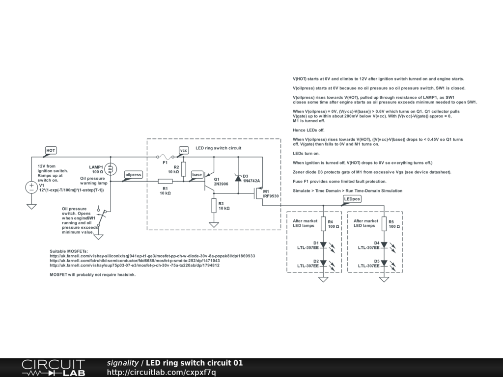 V(oilpress) starts at 0V because no oil pressure so oil pressure switch, SW1 is closed.