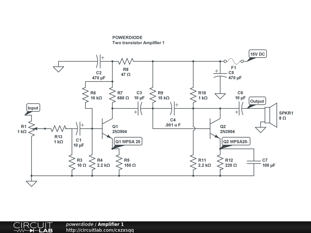 Two transistor amplifier. (15volts power supply)