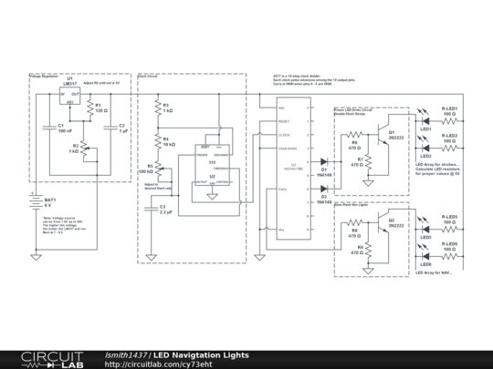 I needed a circuit that would use LED's to emulate navigation lights and strobes for a model. Currently going to install this on a Polar Lights 1:350 scale USS Enterprise.