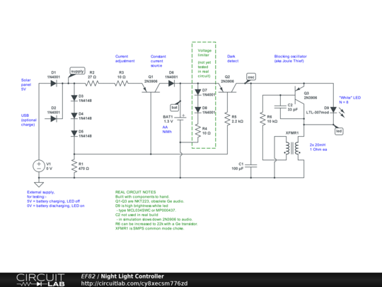Dark Detect Q2 turns on, sending power to the blocking oscillator point osc, when the voltage at point supply drops below about 3V. Note that connection of USB power at the input will turn off the LED even in darkness. LED turn on/off is soft, unlike many similar circuits where the transition is made sharp by using hysteresis.