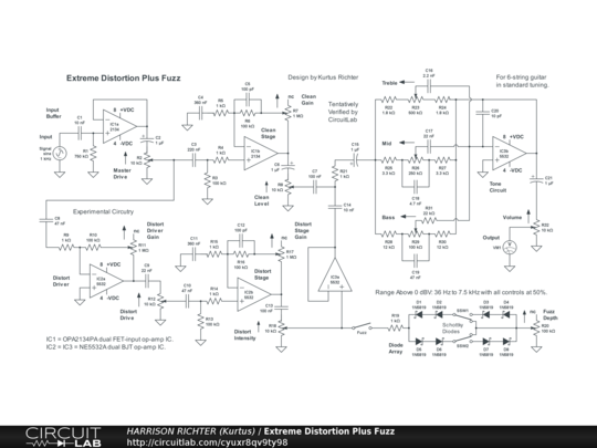 Circuit provides extreme distortion from op-amps, plus fuzz from a hard-clipping diode array (employing Schottky diodes), along with 3-band active tone. Controls Include: Master Drive, Clean Gain, Clean Level, Distortion Gain, Distortion Drive, Distortion Stage Gain, Distortion Intensity, Fuzz enable switch, Fuzz symmetry switches (two, with 2 settings each), Fuzz Depth, Bass, Mid, Treble, and Volume. Range at or above 0 dBV is froom 34 Hz to 8 kHz. Suitable for 6/7/8-string guitar or 4/5/6-string bass. A high-gain circuit with controls set > 50%. Maximum gain = +28.8 dBV (Vo/Vi = 27.5) @ 1 kHz with all controls at 50%, or +66.8 dBV (Vo/Vi = 2188) with all controls at 100%. Do not use circuit with all controls kept at 100% except as a worst-case scenario during breadboard testing. The Treble control will cut 10 kHz from -2.4 dBV down to -14.2 dBV, or boost it to +3.5 dBV. The Bass control will cut 100 Hz from +17.8 dBV down to +12.4 dBV, or boost it to +23.7 dBV. Note that the Diode Array is part of the distortion circuitry, so the clean signal is unaffected by it, and the clean and distorted/fuzzed signals can be separately mixed by the user in the tone-control circuit. Power-supply not shown. Requires a regulated dual-polarity DC supply providing +-9VDC or +-12VDC or +-15VDC at >= 60 mA of current. And while simulator verified, treat the circuit as experimental. Breadboard test before committing to a soldered build.