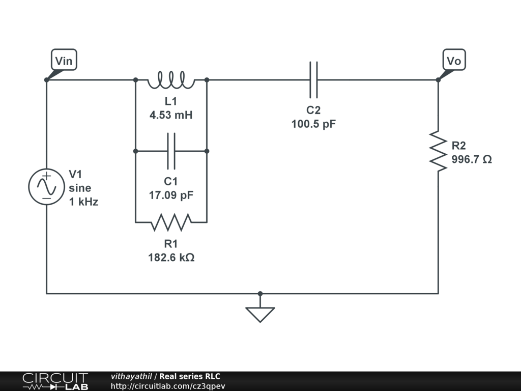 Series RLC circuit for lab L. I used my component values for the circuit. The coil is self resonant at 572 KHZ, giving C(L) = 17.09pF. For R1=(w*L)^2/Rcoil, I used Rcoil of 200 Ohms at 220 KHZ. This is a rough estimate from Vo(w0) and could be determined more precisely. In simulate mode run frequency domain analysis. The resonant frequency is lowered from 235 KHZ for an ideal L of 4.53mH to 219 KHZ, matching measured value. |