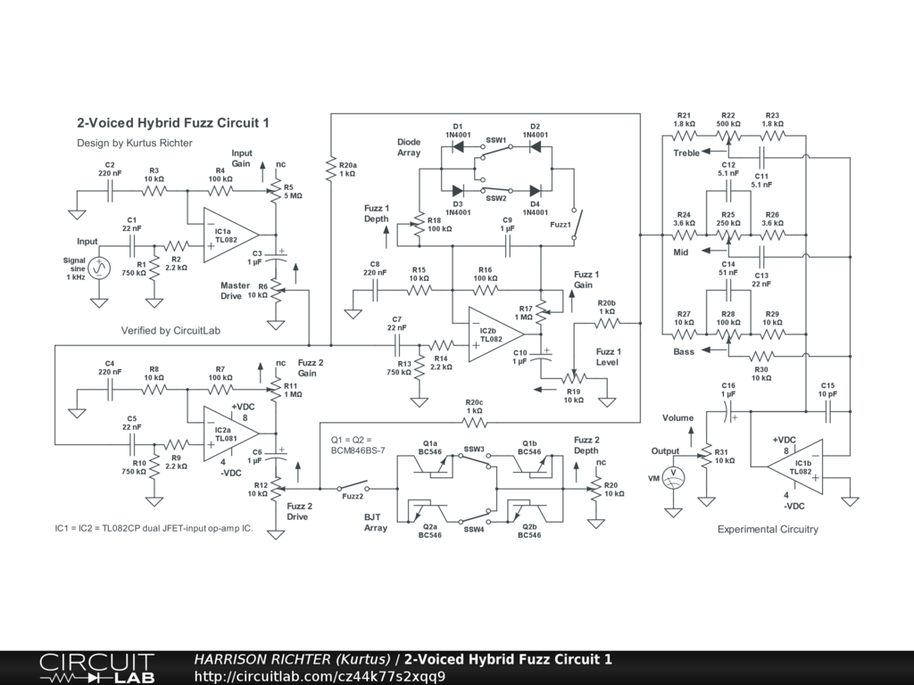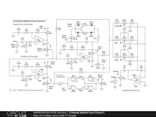 2-Voiced hybrid diode + transistor fuzz circuit for guitar, with 3-band tone. The fuzz voices are from two arrays with different devices; one soft-clipping diode array with dedicated op-amp, and one hard-clipping transistor array, using transistors configured to work as diodes, with a separate dedicated op-amp. The "hybrid" designation indicates use of both hard-clipping (shunt type) and soft-clipping (feedback type) arrays, along with different kinds of fuzz-generating devices in the arrays. Controls Include: Input Gain, Master Drive, Fuzz 1 enable switch, F1 symmetry switches, Fuzz 1 Depth, Fuzz 1 Gain, Fuzz 1 Level, Fuzz 2 enable switch, Fuzz 2 symmetry switches, Fuzz 2 Gain, Fuzz 2 Drive, Fuzz 2 Depth, Bass, MId, Treble, and Volume. Range above 0 dBV is from 25 Hz to > 25 kHz. Suitable for 6/7/8-string guitar or 4/5/6-string bass, with emphasis on mids and highs (from 250 Hz to 2.5 kHz). Maximum gain = +30.8 dBV (Vo/Vi = 34.7) @ 400 Hz with all controls at 50%, or +61 dBV (Vo/Vi = 1148) with all controls at 100%. Tone controls offer the following adjustments above and below the response curve obtained with all other controls at 50%: Treble, +-10.8 dBV. Mid, +-17.2 dBV. Bass, +-13.5 dBV. Power-supply not shown. Requires a regulated dual-polarity DC supply providing on of the following: +-9VDC or +-12VDC or +-15VDC at >= 60 mA of current. And while simulator verified, treat the circuit as experimental in nature. Breadboard test before committing to a soldered build. House completed project in a grounded metal enclosure.