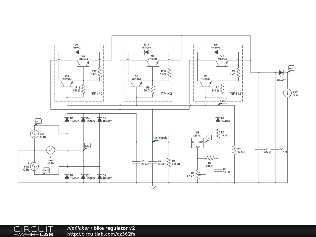 Hi again, You still have that spurious ground connection to the star point of the alternator. If do you have a wire that you are sure is connected to the star point it should go to a 4th pair of (low power) diodes in the wired the same way as the three pairs of high power diodes in the rectifier. You may get about about 3% more power out of the stator due to the current imbalance at the start point. Also note that your Darlingtons are not connected correctly. CL has put wire bridges where there should be joins. It's good practice to not join 4 wires in a + but to stagger two of the joins so that you have two 3 wire joins close together (a | followed by a T). Have you given any thought to short circuit protection? |