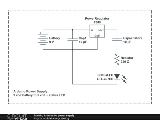 Basic Arduino power supply circuit. Super simple - just a 9 volt battery and a status LED. The 5v and ground lines can be used by the ATMega chip or any other components.