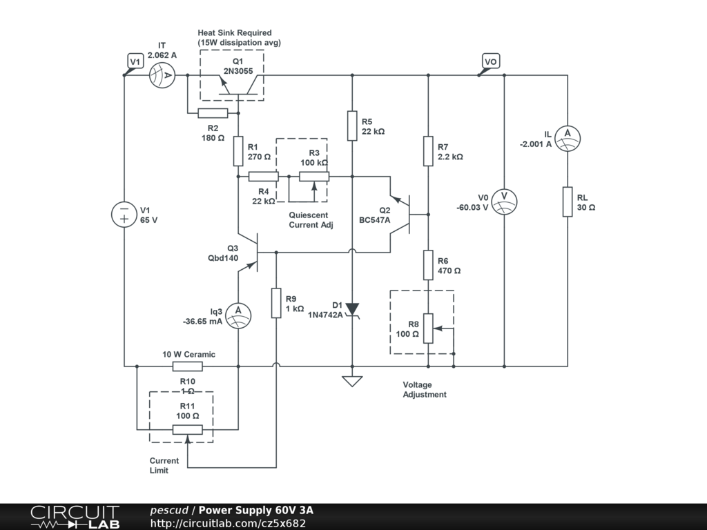 Q1 is the series pass element which is controlled by Q3. Quiescent current adjusted by R3, Q2 comprises the the error amplifier with D1 as voltage reference. Output voltage is adjusted by R8. Current limit is provided by shunt R10 and R11, a 100 ohms potentiometer. Q1 needs a bulk heat sink, since it will dissipate 15W aprox. Q3 should also be mounted on a heatsink since power dissipation can be as 2.5W at full 3A output. Filter Capacitors should be added on the output terminals 2500 uF x 64V, RFI filtering would be good at input,