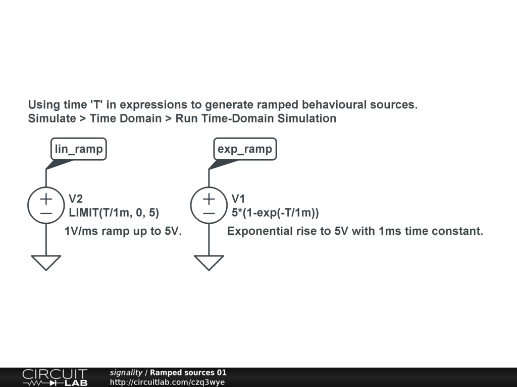 Using time 'T' in expressions to generate ramped behavioural sources.