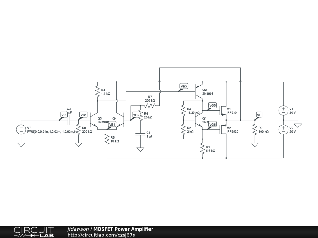 A simple push-pull class AB MOSFET power amplifier.