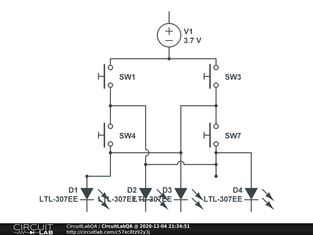 I am using LEDs as an example but the load will vary, such as a combo of LEDs and motors. I want to use the same voltage source(3.7V battery). At any given time, only one load is in use but the deciding factor is the combinations of switches selected. Depending on the path to theload, yes, there will be resistors added to my circuit but I would like to remove the push buttons and replace them with bjts. I am open to any suggestions. |
