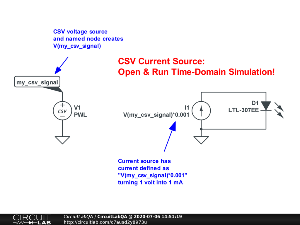 What a really great question - I found out a lot about CIRCUITLAB! (I was unable to find an element like CSV current source). Try this procedure (it works on my system): 1] Run simulation "CSV Voltage source Example" https://www.circuitlab.com/editor/#?id=7mzk9j BUT with only one output V(PWS_CSV_OUT). 2] Export the results as a CSV file (at the top right of the Transient Analysis graph "Export Plot CSV"). 3] Open the CSV file in a text editor. Copy the data points WITHOUT the final comma. 4] Paste the data inside the brackets of PWS() in the current source. (Magically, the LF characters disappear). 5] Check this example I_source_control https://www.circuitlab.com/editor/#?id=49ytmx28mg38 Note: I don't know the size limit for expressions such as PWL() and PWS(). In the example there are 250 data points in a file of 5k5bytes. Happy experiments! |