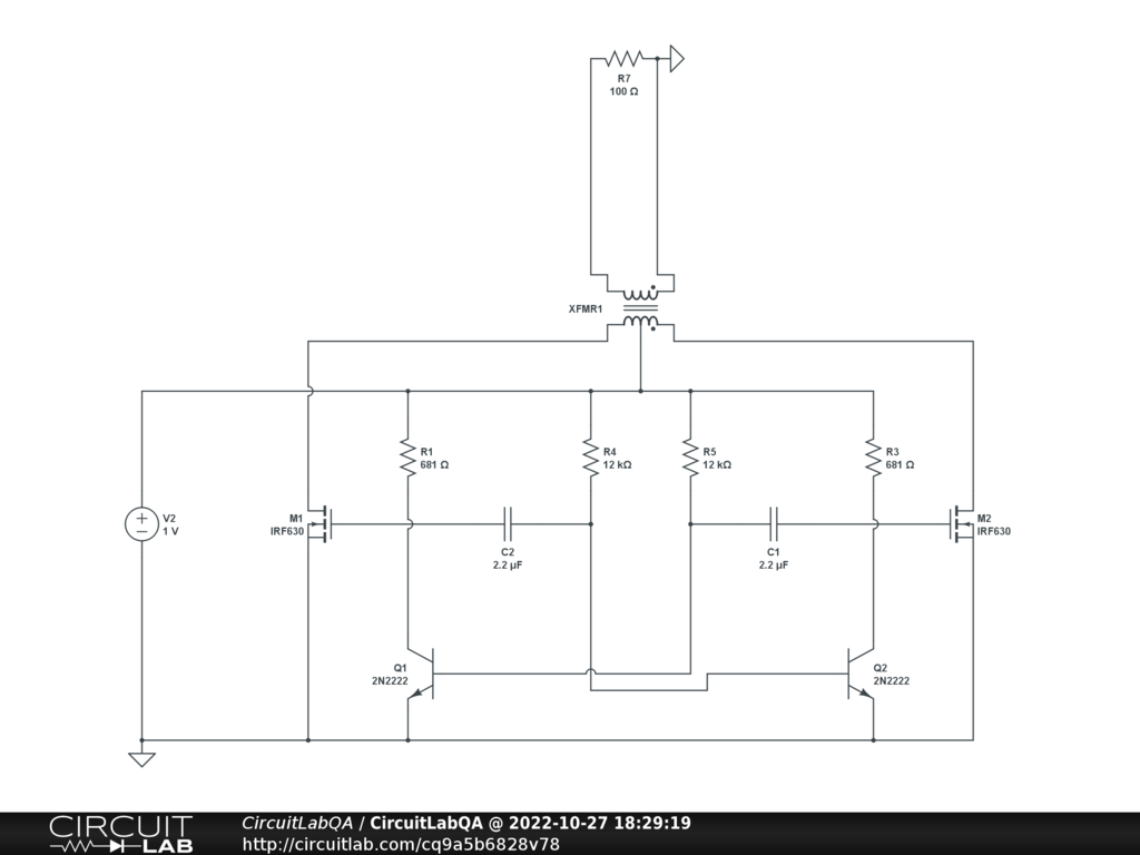 McAfee does not allow me to see the site you supplied as reference. Many flaws in the circuit. First, note that the circuit is symmetric (fold it through a vertical) while you want an anti-symmetric result (the oscillation). In real life, the oscillation may start because of some difference (in the transistors, resistors, capacitors), but numerically, the symmetry is too strong, and the oscillation does not start. We MUST include a "light" numerical difference (in the resistor) to break the symmetry. How much? that depends on each numerical simulator. Second, the wiring is wrong. Each capacitor has to be tied to each of its ends to one of the resistors. Right now, each cap bypasses the connection, that it should NOT. Third, the DC voltage should be high enough to satisfy the threshold of Vbe for the BJTs and ... Vgs(th) for the NMOS. One volt is clearly not enough. Fourth, the NMOS. A transistor is like something which squeezes a water hose, to block the flow, or to relax the sqeeze and allows the flow to run through a water hose. BUT the FLOWS has to be possible. Right now, for the NMOS, their GATE pin is the squeezer, their source pin is connected to the ground, nice, BUT their drain pin, which should receive the flow, is NOT CONNECTED to ANY flow. You may have a better result by removing them completely and connecting the transfo directly to the intersection point of the cap-resistor-BJT_Collector. There may be other problems. While that oscillator is often used for demonstration purposes, it is not often used for practical application. Among other problems, is to start the oscillation, even in the real world, when the "load" is something else than a LED. Well, if it works for you, fine. |