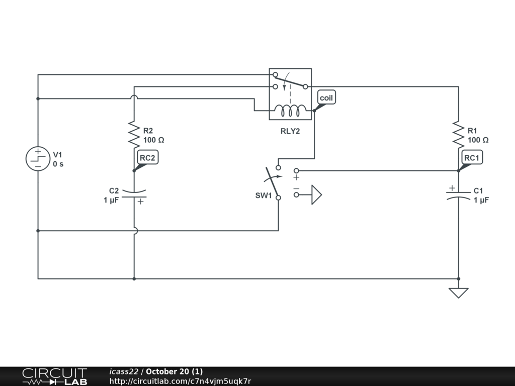 I don't know exactly for what the relay and the switch are intended for, but using a PMOS (MOSFET channel type P) and a NMOS ( MOSFET channel type N), as shown, "could" cover the required functionality, in part. The PMOS will open the circuit as soon as the voltage at its gate reaches VGS(TH) or more. The NMOS will starts to conduct when the voltage at its gates reaches it own VGS(TH). Well, when I say "conduct", that means that a current can flow between the D (drain) terminal and the S (source) terminal of the MOSFET. Here, the Drain of the NMOS is hanging to nothing, so no current would flow. Note the the Source terminals are connected to the voltage-source, the N egative side of the voltage source for the N MOS and the P ositive side of the voltage source for the P MOS. Note that to restart the circuit, you may want to add a switch between the gate terminal of M1, the PMOS, and the ground. As example, if VGS(TH) of M! is 4 volts (generally, but not always, given as -4.0 v, that is, with a negative sign, on datasheet for a PMOS), the circuit will have a close loop through M1, but that loop will get broken when the voltage at Node1 will reach that 4 volt with that condition (within the tolerance given in the datasheet, for that parameter). You won't get more than 4 volt at Node1. Sure, the gate of M1 has some leak, so its voltage could drop, which close the loop previously broken, but that would involve a counter reaction that should recharge the gate within, hopefully, a few femto-second and should not interfere with the conception. |