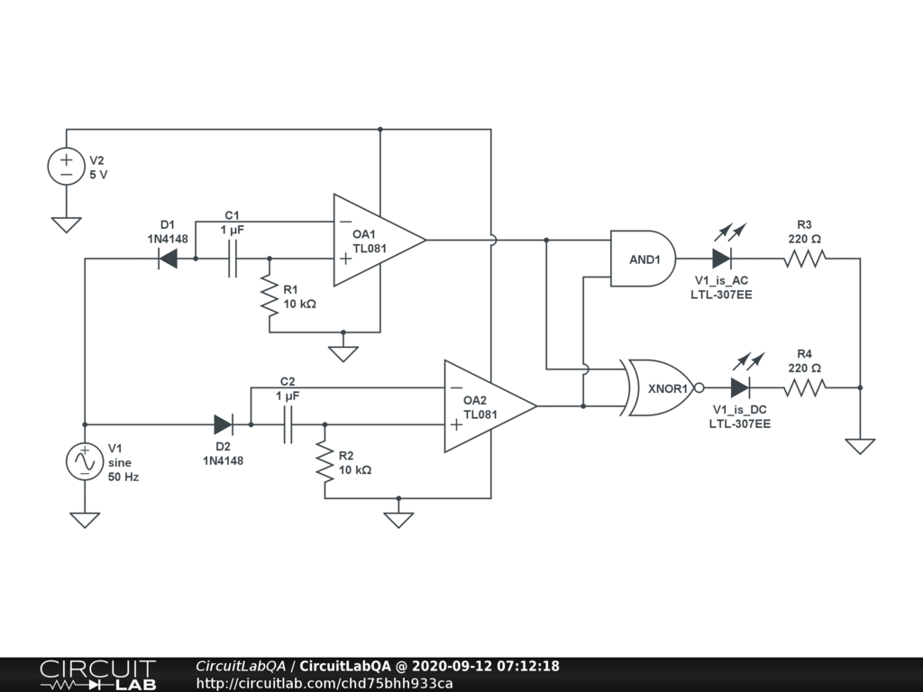 I haven't been able to run a time domain simulation, here, but it seems to be working. First, I don't know what is a "wapda". I assumed that the goal was to possibly determine if a source, here V1, is an AC or a DC, while the circuit has to be not-mobile, stationary. I also assumed that you can decrease the possible AC voltage to around 5 volt (peak to algebraic mean of zero volt). The circuit principle is quite simple, a diode allow a capacitor to be charge, when the voltage is on the appropriate "direction". For a DC voltage, that occurs just for one of the two groups Diode-capacitor, while for an AC voltage, that allows to charge the two capacitors. I haven't show the switch, but it could be between at one of the two terminal of the source V1. The capacitors R1 and R2 would automatically bleed the capacitors to 0 volt when you turn the switch off. You can increase their value to minimize the power consumption of those, then the switch is on. The two op-amps are used to buffer the voltage at the end of the capacitors. The and-gate will turn on if both op-amps supply a voltage as a logical high. The op-amps and the logic circuit used should be compatible, including the fact that most op-amps CANNOT reach the rail voltage, here, they cannot REACH 0 volt exactly (but probably something around 1 volt as the minimum output that they can reach, as a minimum output). Have a logic circuit family which will consider that low voltage as being a logical 0. The XOR (or XNOR) gate produces a high value if one and only one of the two op-amps generates a logical high, that is, if the source V1 is DC. Here, the two bulbs are represented with LED, but if you are using 12V bulbs, the logic circuit (AND and XOR gates) would probably not be able to supply that. You will need to add transistors or relays (which is relatively a standard circuit that I didn't found required to be shown here). And once again, working with high voltage (that is, more than 50 volt) can be life threatening, or can cause serious damage or be the reason for a fire. |